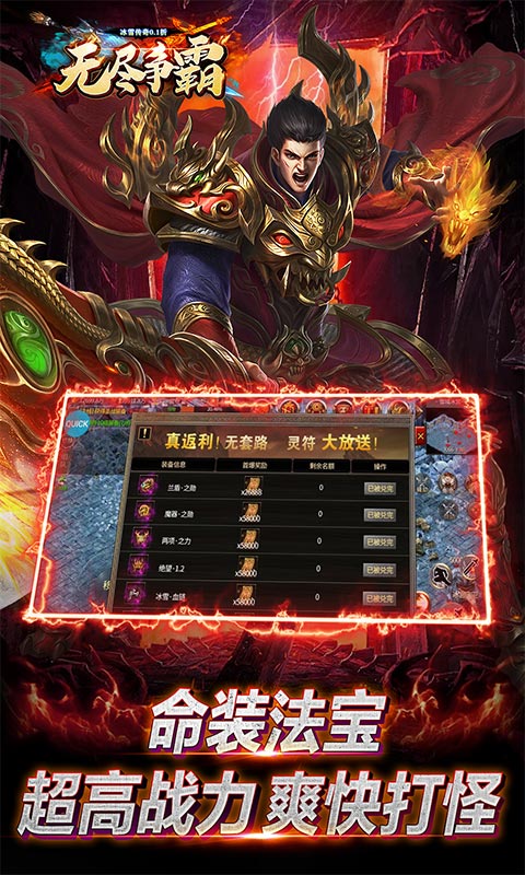 ☆上线送人物经验*6000、刺客剑法*1、回城石*50、5万真充灵符、月光宝盒*1 ☆首充1毛钱传奇当大哥 ☆在线领亿万经验、万元元宝 ☆主打谁开狂暴就打谁,掉灵符 ☆真返利!无套路、灵符大放送 ☆血战沙城、无上荣耀、实力决定沙巴克命运!