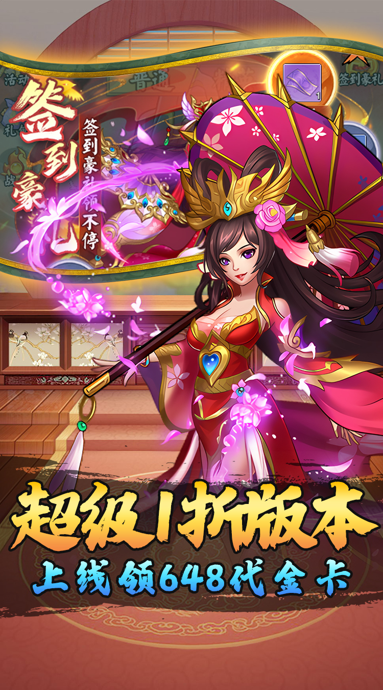 1、1折靶心割草、肉鸽三国免费版,每日保底送648线下代金券无压力毕业 2、全新折扣重磅福利,上线领648代金卡, 3、官服原版,物价0膨胀