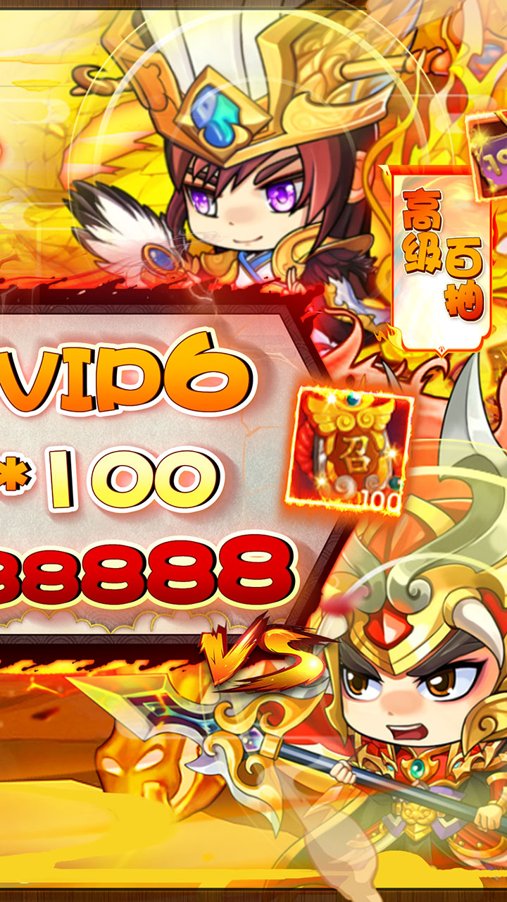 上线福利:vip6、元宝*888888、100召唤令、1000突破石、1000初级武将精华、800飞升丹、800时装精华(邮件获取)、银币*5000w 1.创角即送高级百抽,强势出征!(新手出征福利邮件) 2.上线即送满v6,vip奖励免费领! 3.8日登录领豪华真充,极品金将! 4.闯副本突星数,万能碎片、元宝送不停! 5.超值vip特权,时装、武将、装备等豪礼免费领!