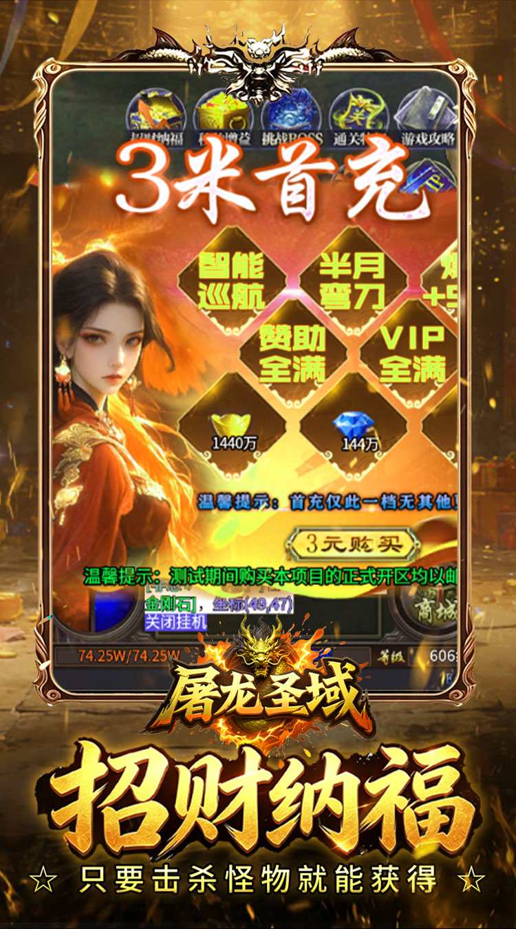 ★招财纳福★ 只要击杀怪物就能获得大量元宝,钻石,无需花钱! ★秒秒增益★ 在线就能涨积分,可以兑换任意货币 ★签到奖励★ 每日登录,即可领取大量元宝,钻石以及金刚石! ★在线奖励★ 累计在线时长,还可领取大量货币 ★冲级奖励★ 达到特定级数,可领取元宝,钻石,还有专属法器