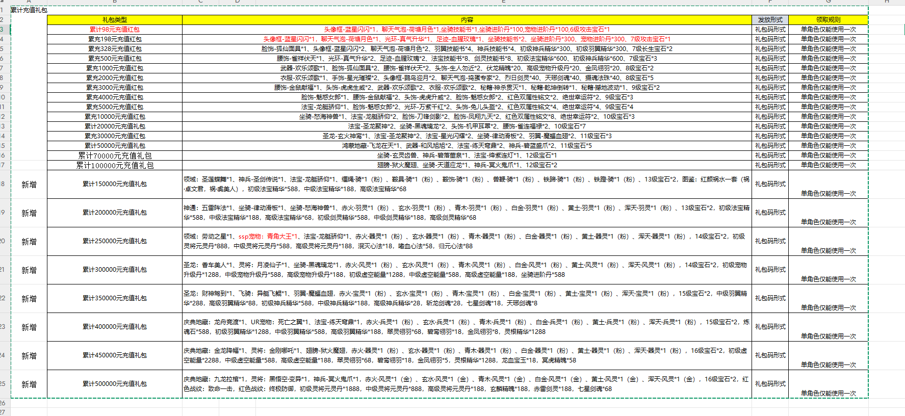 | 累充500元充值红包 | 羽翼技能书*4、法宝技能书*4、神兵技能书*4、剑灵技能书*4、坐骑技能书*4、7级宝石*5 | 礼包码形式 | ||