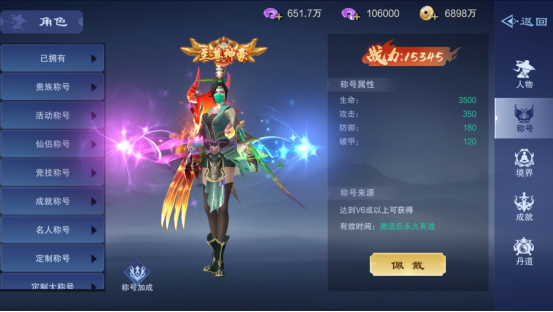 左侧列表为称号来源分配,未获得的称号也可以通过点击查看获取途径,右侧为称号的属性详情