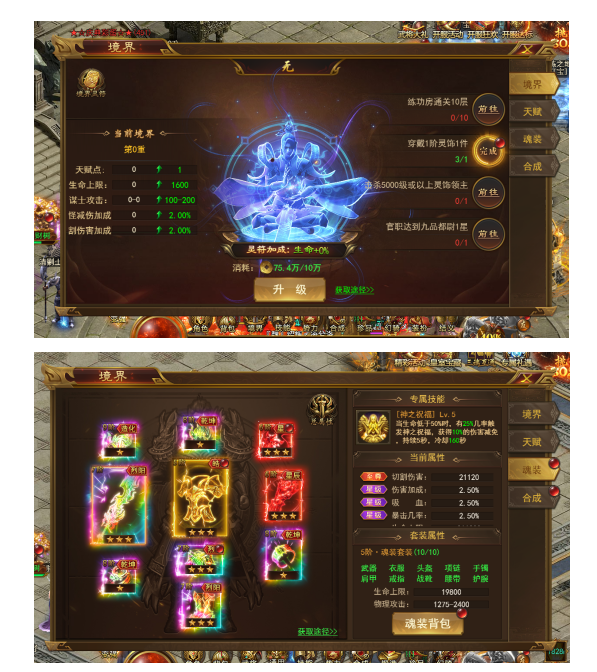 Ø 野外刷怪可掉落境界魂装,穿戴魂装可获得至尊属性增长,更可激活魂装套装激活魂装神技