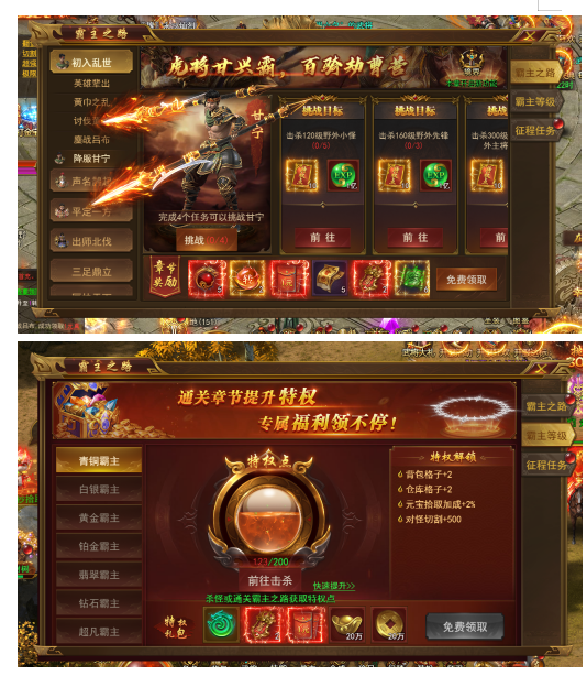 v 完成霸主之路任务,可领真充红包,获取极品武将,提升霸主等级后获得巨额属性提升!