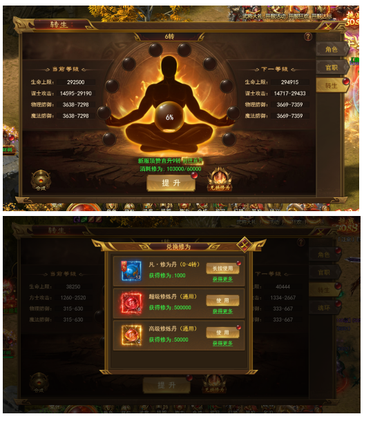v 提升自身转生等级可获得巨额属性提升,可进入更高级打宝地图,穿戴更高转转生装备,战力飞涨,所向披靡!
