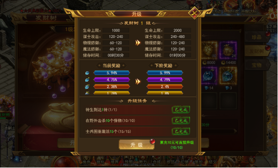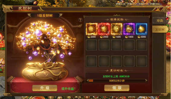 v 无压力挂机获取珍品奖励,升级发财树可获得更高阶奖励!